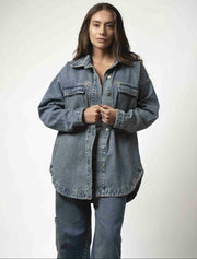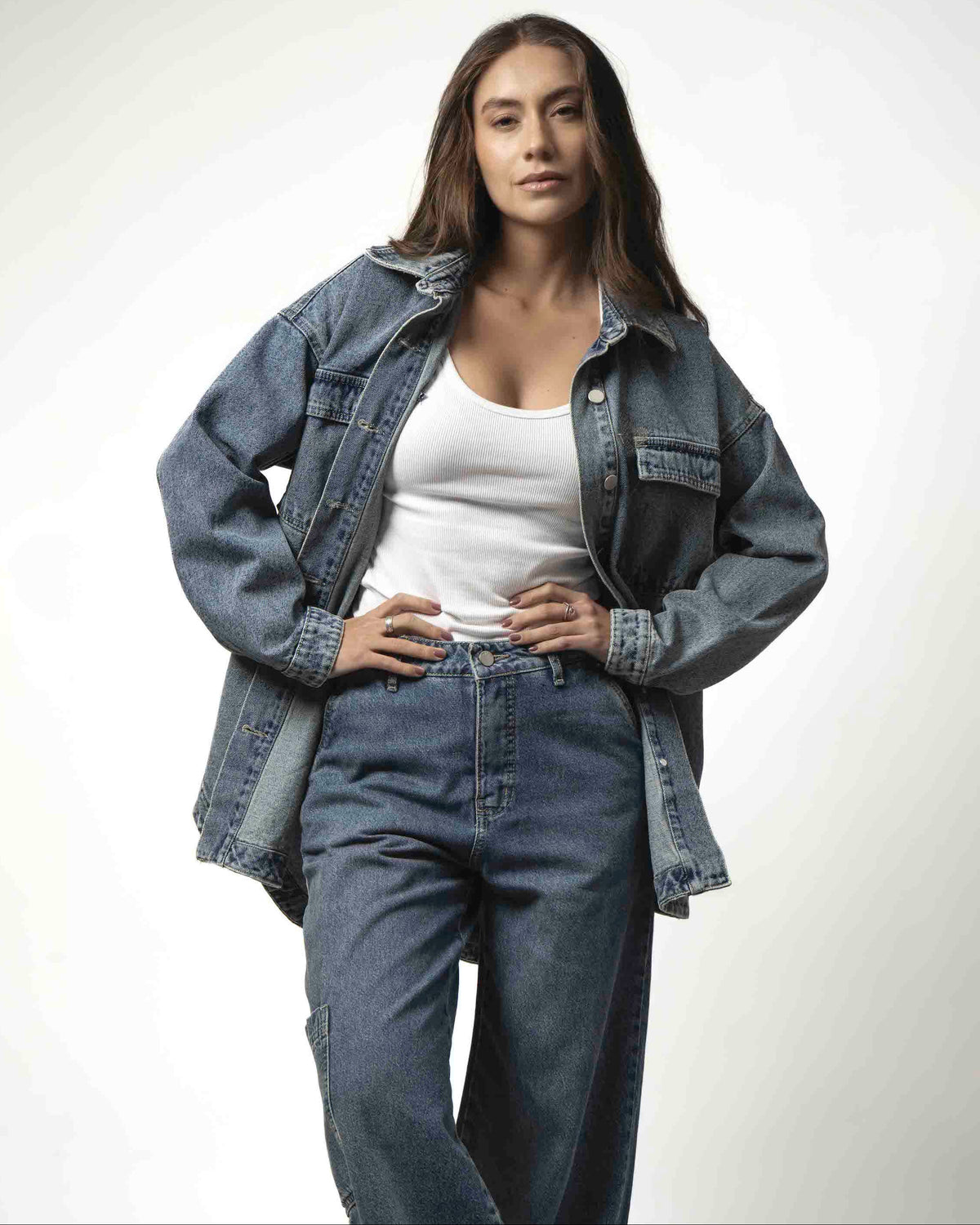 Sobrecamisa 100% algodón, calce oversize, manga larga que termina en puños con abertura y botones. Bolsillos de parche delanteros y bolsillos costados. Cierre frontal con botones metálicos. Color azul.