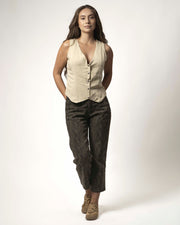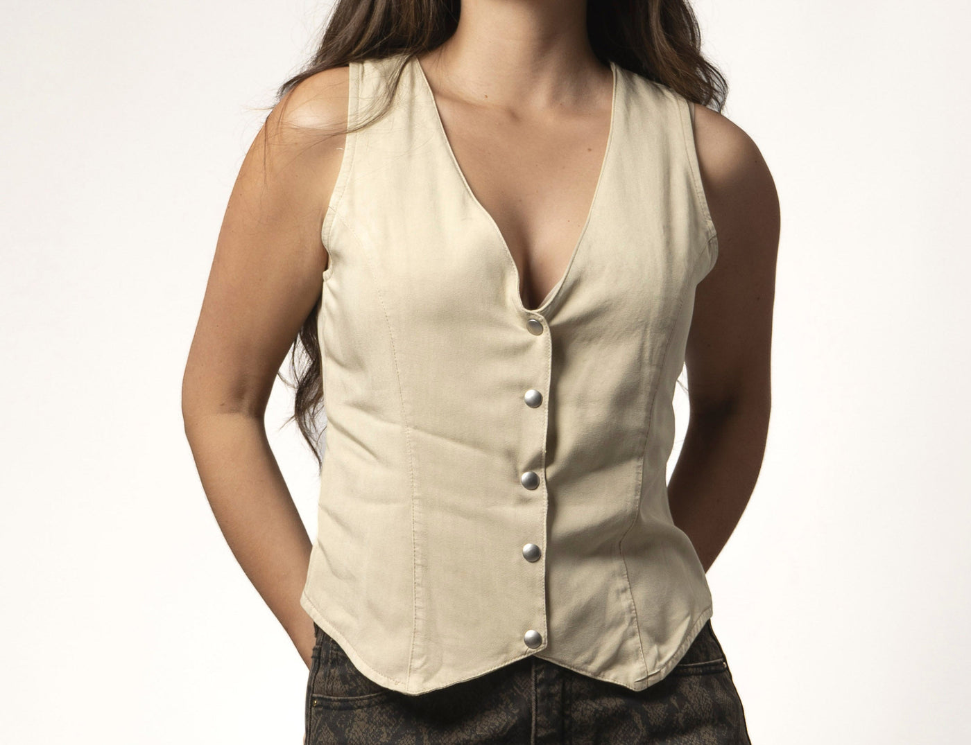 Gillette 100% viscosa, teñido en prenda presenta una tela delgada para mayor ligereza. Con broches en el delantero, este gillete es cómodo y versátil, ofreciendo un estilo clásico con la comodidad característica de esta tela.