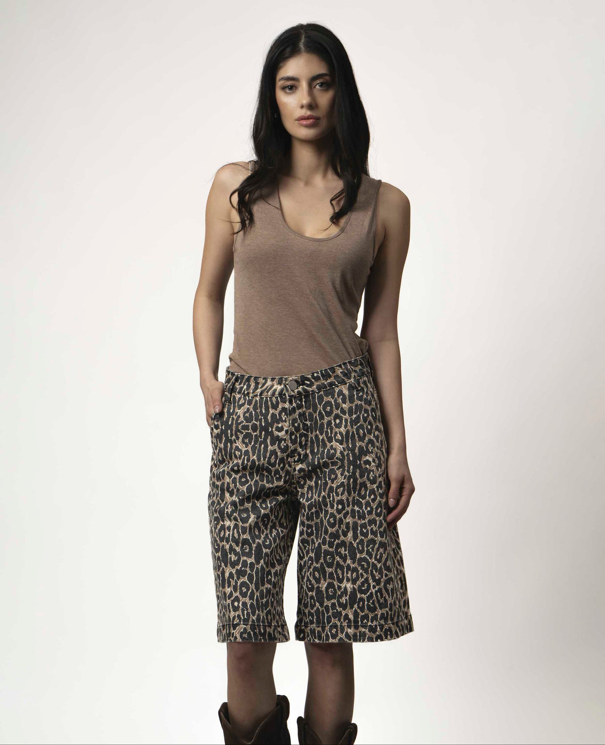 Bermuda 100% algodón, tiro alto, cierre frontal con cremallera y botón.