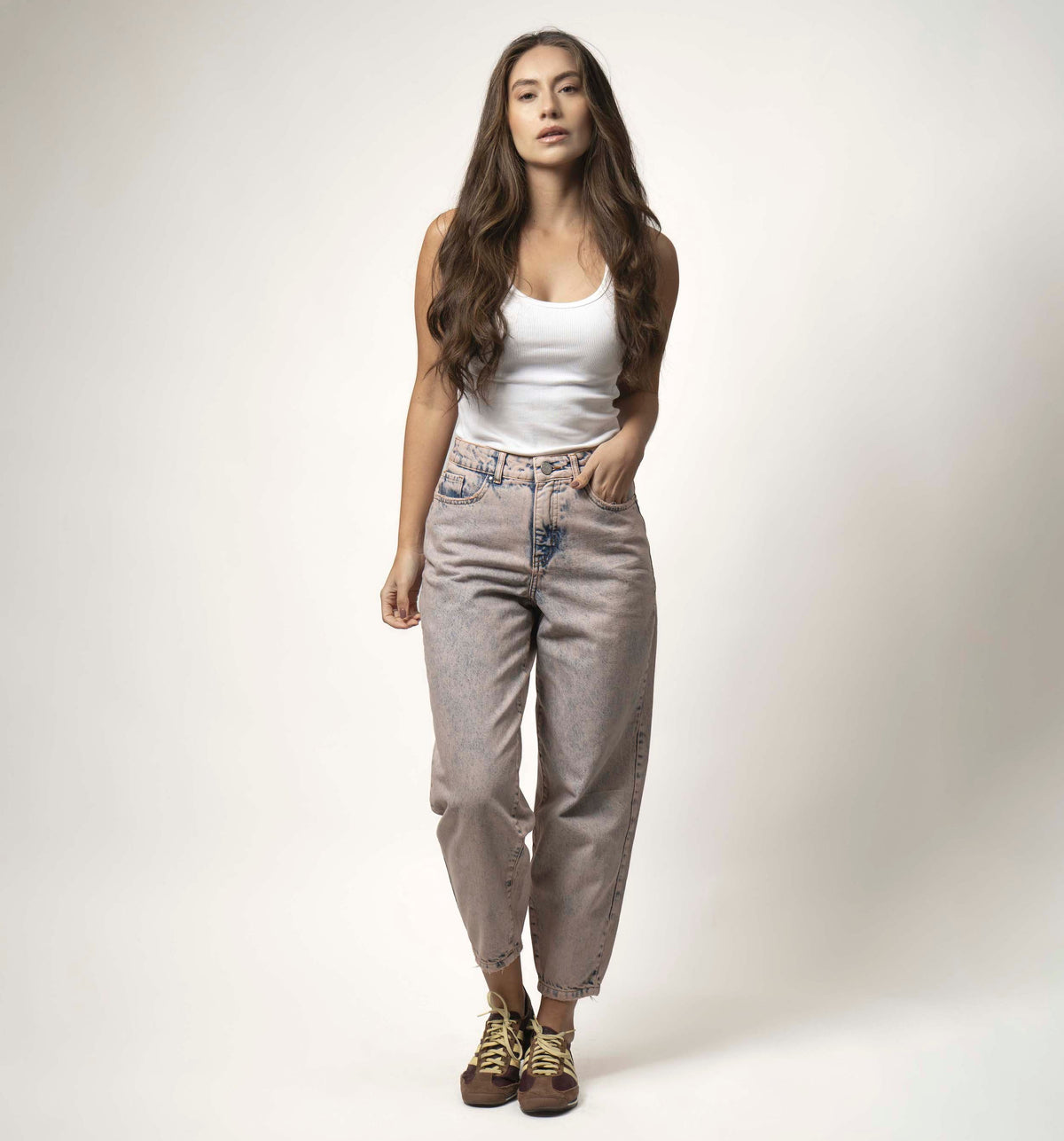 Calce Globo, Baggy o también llamado slouchy, 100% Algodón, cintura alta que estiliza la figura, muslos y piernas ligeramente holgadas, rodilla ancha terminando en una basta angosta. Esta prenda es un elemento básico del armario con tela fija en un lavado perfectamente desteñido. Hecho en Chile.