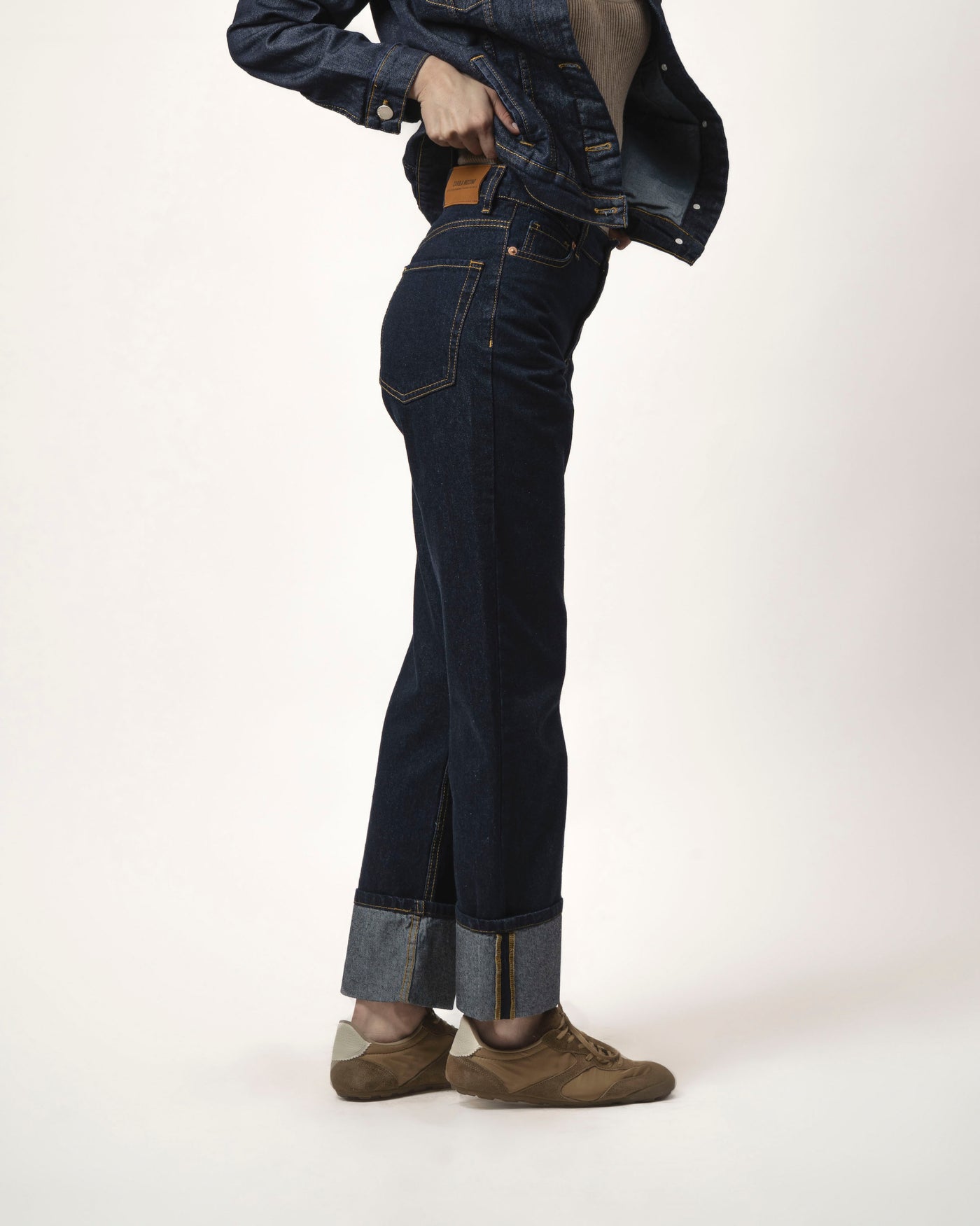 Jeans Emilia en azul raw, 100% algodón, de calce recto y tiro medio. Su mezcla de texturas y lavado suave aporta un look contemporáneo y versátil, perfecto para usar durante todo el año. Un diseño cómodo, con estructura y un acabado deslavado que realza su carácter urbano y atemporal. Detalle de basta roll up.