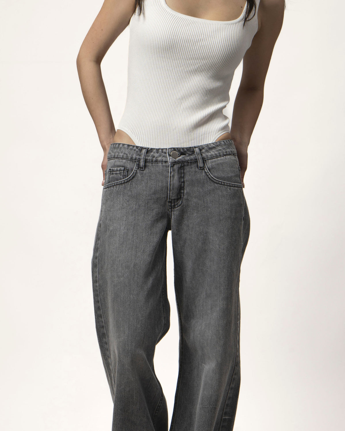Jeans Low Rise, 100% algodón. El tiro bajo vuelve con fuerza, y este jeans es la versión moderna y elegante de la tendencia. Diseñado en un tono gris vintage que aporta actitud y versatilidad, destaca por su calce relajado en la cadera y su pierna wide leg, que estiliza y aporta una silueta alargada sin perder comodidad.